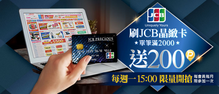 持卡人於活動期間每月可於PChome線上購物參與一次,每月擇一週使用JCB晶緻等級以上信用卡暨簽帳卡單筆消費達新台幣2,000元(含)以上,並至本活動專屬網頁參加登錄成功後(需先消費再進行登錄),即贈價值等同現金NT$200之PChome線上購物《P幣》(以下簡稱P幣)。