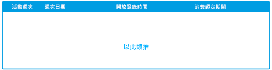 ※本活動週次、開放登錄時間以及消費認定期間約定如下:
