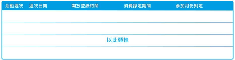 ※本活動週次、開放登錄時間以及消費認定期間約定如下: