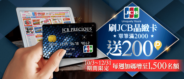 持卡人於活動期間每月可於PChome線上購物參與一次,每月擇一週使用JCB晶緻等級以上信用卡暨簽帳卡單筆消費達新台幣2,000元(含)以上,並至本活動專屬網頁參加登錄成功後(需先消費再進行登錄),即贈價值等同現金NT$200之PChome線上購物《P幣》(以下簡稱P幣)。
