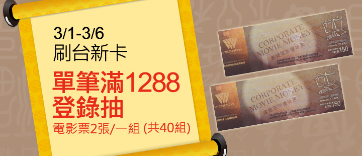 1. 活動內容:108/3/1(五)00:00:00-108/3/6(三)23:59:59 活動期間內每一會員帳號刷台新信用卡單筆消費滿1288元,即可參加登錄抽威秀影城電影兌換券兩張(1組)活動,共40名。(市價$480)