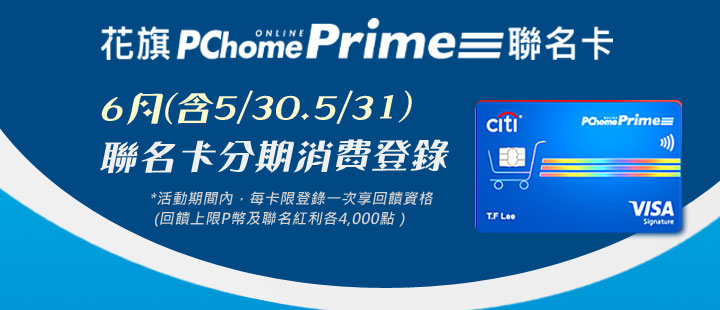 2.本活動限活動期間內刷花旗PChome Prime聯名卡之新增分期消費(單筆分期指定期數以上)適用,請依活動網頁公告為準,正、附卡消費合併計算。