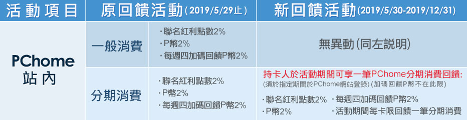 6.本活動回饋之聯名紅利及P幣將依每期分期交易請款金額四捨五入計算逐期回饋。聯名紅利最快將於每期分期交易請款後之8-10周內分別回饋至正卡之信用卡帳戶中;回饋P幣最快將於每月登錄截止日當月月底回饋至正卡綁定之PChome線上購物帳號中。