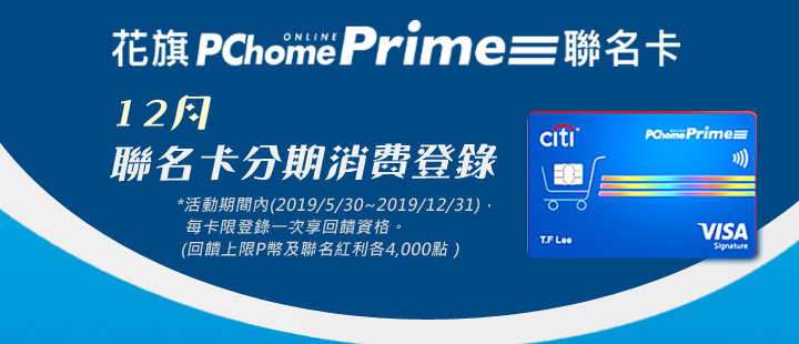 1.本活動(2019/5/30~2019/12/31)提供花旗(台灣)銀行在台灣發行之PChome Prime聯名卡(不含晶片金融卡)持卡人參加。
