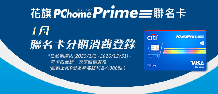 1.本活動(2020/1/31~2020/12/31)提供花旗(台灣)銀行在台灣發行之PChome Prime聯名卡(不含晶片金融卡)持卡人參加。