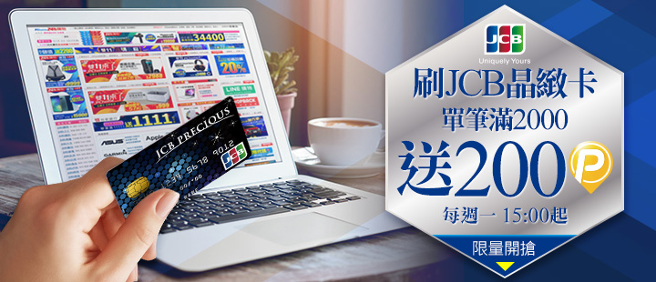 持卡人於活動期間刷JCB晶緻等級以上之信用卡暨簽帳卡消費單筆滿額NT$2000,並至本活動專屬網頁參加登錄成功後,即贈價值等同現金NT$200之PChome線上購物《P幣》(以下簡稱P幣)。