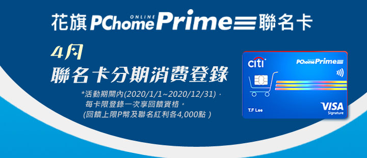 1.本活動(2020/1/31~2020/12/31)提供花旗(台灣)銀行在台灣發行之PChome Prime聯名卡(不含晶片金融卡)持卡人參加。