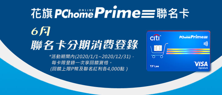 1.本活動(2020/1/1~2020/12/31)提供花旗(台灣)銀行在台灣發行之PChome Prime聯名卡(不含晶片金融卡)持卡人參加。