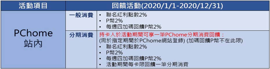 6.本活動回饋之聯名紅利及P幣將依每期分期交易請款金額四捨五入計算逐期回饋。聯名紅利最快將於每期分期交易請款後之8-10周內分別回饋至正卡之信用卡帳戶中;回饋P幣最快將於每月登錄截止日當月月底回饋至正卡綁定之PChome線上購物帳號中。