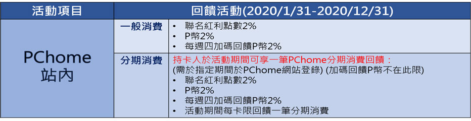 6.本活動回饋之聯名紅利及P幣將依每期分期交易請款金額四捨五入計算逐期回饋。聯名紅利最快將於每期分期交易請款後之8-10周內分別回饋至正卡之信用卡帳戶中;回饋P幣最快將於每月登錄截止日當月月底回饋至正卡綁定之PChome線上購物帳號中。